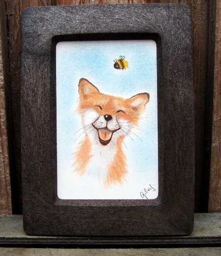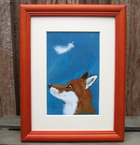 Das Bild mit dem lachenden Fuchs: Rahmen 15 x 20,5 cm - das sichtbare Bild 10 x 14,5 cm - das ist mit Pastellkreide auf Papier gemalt .... Fuchs und Feder ... Rahmen 18 x 23 cm, das sichtbare Bild 9 x 14 cm - gemalt mit Acrylfarben auf Leinwand